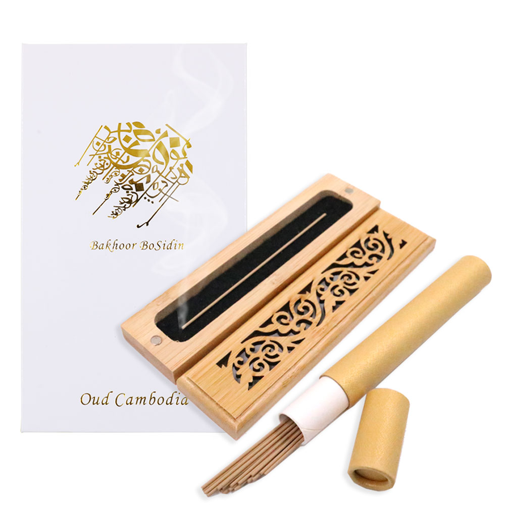 Bakhoor BoSidin Cambodian Oud Incense with Wooden Incense Burner – 20 Incense Sticks – A48W